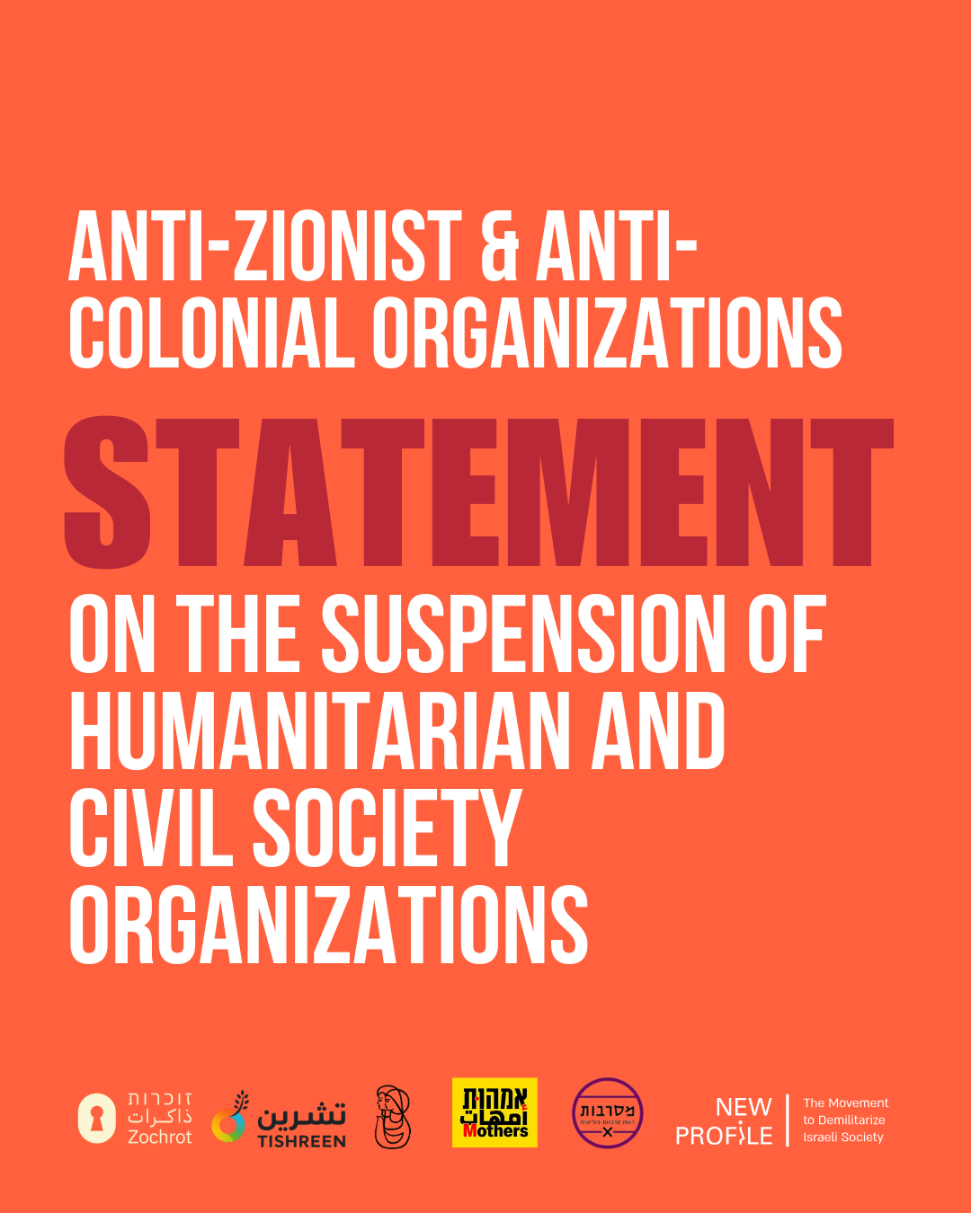 Signed: Tishreen, New Profile, Women Democratic Movement in Israel حركة النساء الديموقراطيات תנד״י , Mesarvot, Mothers Against Violence Israel, Zochrot